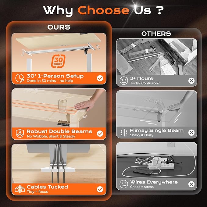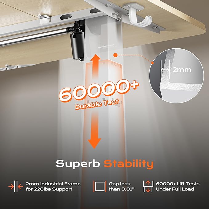 - 【Built to Last with Exceptional Stability】The industrial-grade steel frame and T-shaped design of the stand up desk support up to 220 lbs, ensuring stability and reliability for years to come. Paired with a durable motor, this home office desk is designed to meet the demands of your dynamic workday