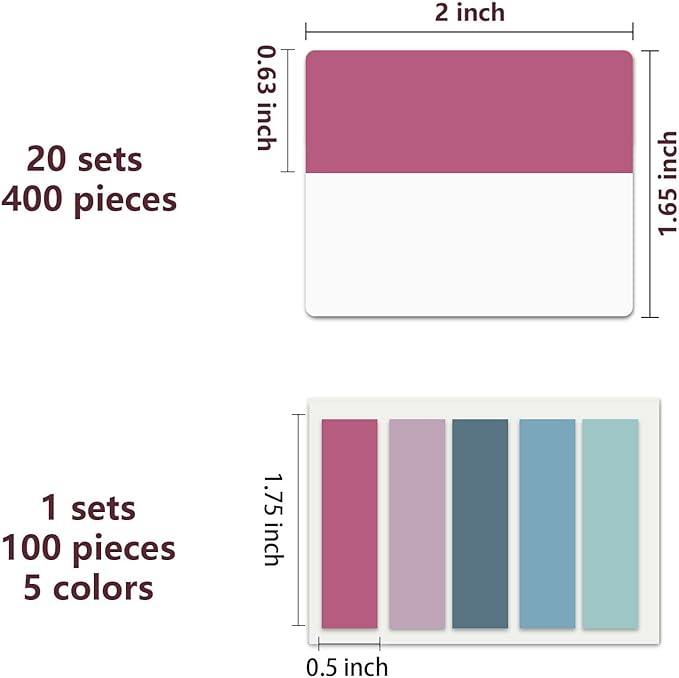 - Package Contents: 500 pieces 21 sets in total, 400 pieces 2 inch sticky tabs in 20 sets with 10 different pastle colors,100 pieces 0.5 in tabs in 1sets, 20 pieces each color