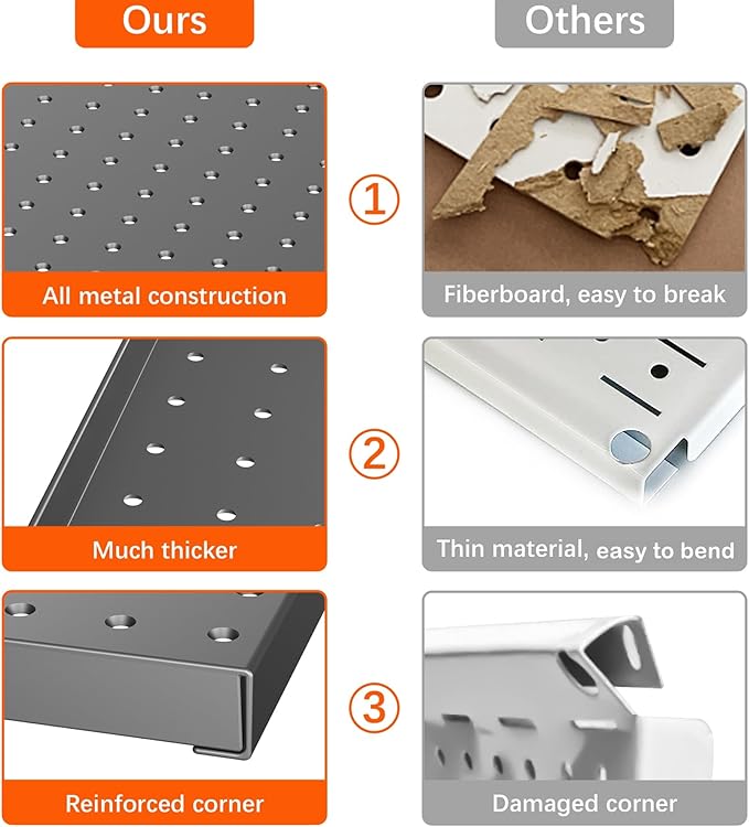 - Built to Last: Pegboard panels are made of high quality steel with powder coated finish, sturdy, scratch resistant and easy to clean. Will last forever, never warp and deteriorate. The metal pegboard will hold the weight of all your tools