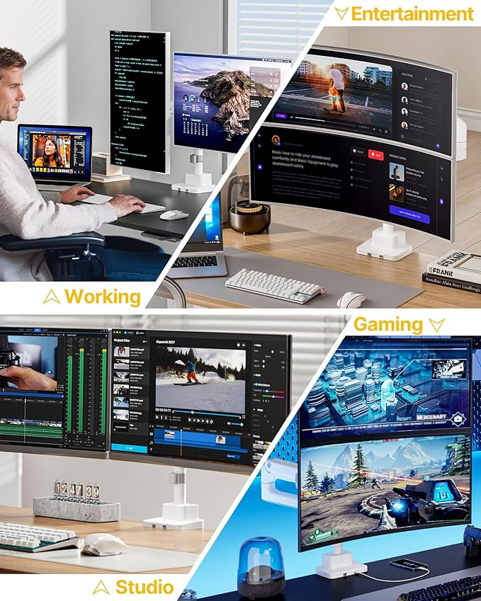 - 【Ergonomic Comfort Meets Ultimate Flexibility】 Engineered for a superior viewing experience, this dual monitor arm offers an extended vertical height range up to 29.4", with a 19.2" pole that helps to reduce neck strain and improve sitting posture during long hours of work or play. The full motion design allows -75° to +75° tilt, ±90° swivel, and ±90° screen rotation, giving you complete control to eliminate glare and find the most comfortable angle for any task. Whether you're stacking two ultra-wide monitors for immersive gaming, coding with split-screen efficiency, or reviewing large data sets side by side, this arm adapts to your workflow seamlessly