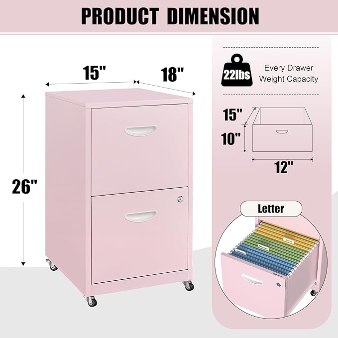 - Sturdy Metal: Pink two drawer filing cabinet is made of high-quality steel, It adopts a powder coating process to stick, forming an effective moisture-proof effect, which is sturdy and easy to clean on the surface