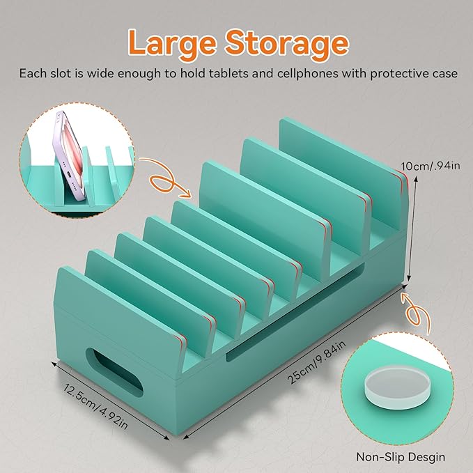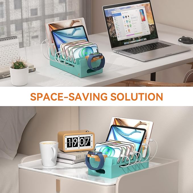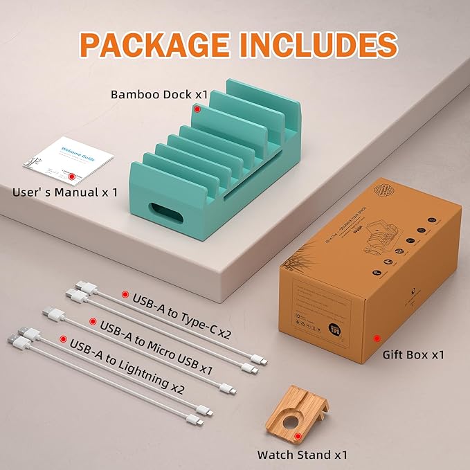 - Compatible with Multiple Devices: The bamboo charging station with Watch Dock Stand, is designed to charge up to your 7 devices simultaneously, matching to the universal cell phones, tablet, E-reader, and more devices no matter how thick case on