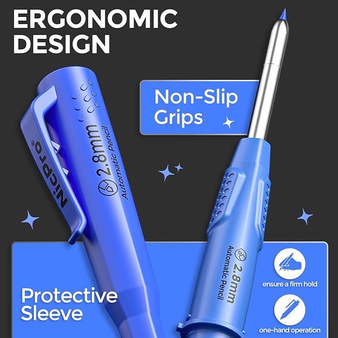 - Ergonomic Design: Our carpenter markers designed with ergonomic and non-slip grips, providing a maximum comfortable user experience.Non-slip surfaces ensure a firm hold, improving control and precision.In addition, includes a practical pocket clip, making it easy to carry and access on the job site