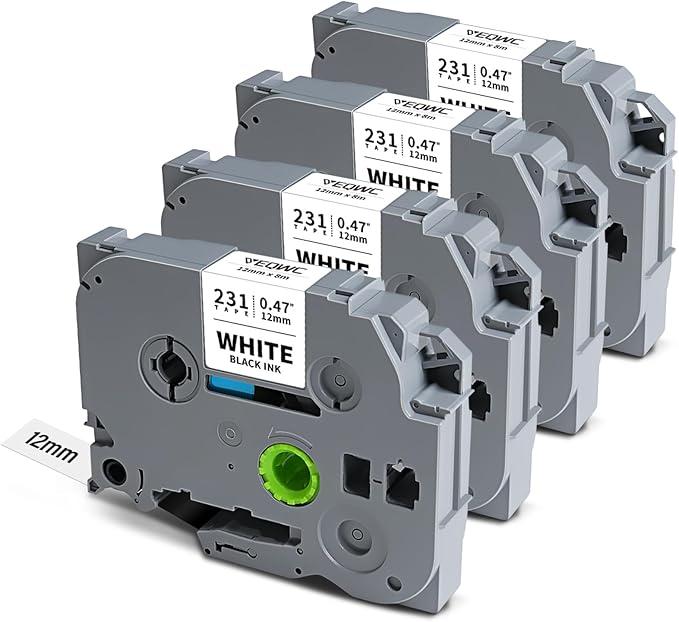 - Package Included: 4 Pack replacements compatible for Brother Ptouch label maker tapes TZe-231. Dimensions: Each pack measures 1/2" (0.47") in width and 26.2 ft (8m) in length, totaling 48 meters across all packs. The 12mm tape is a standard size frequently used in everyday applications.