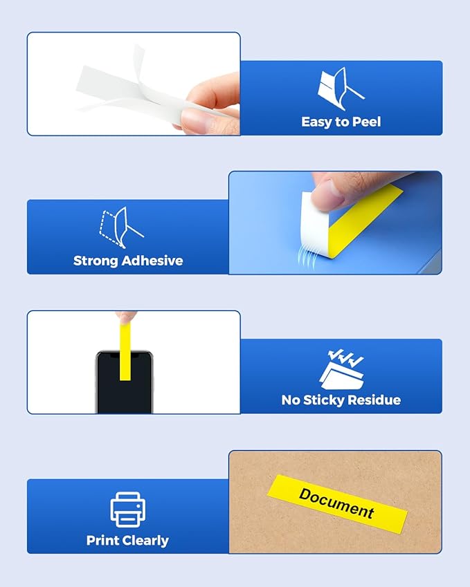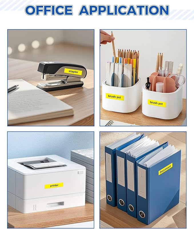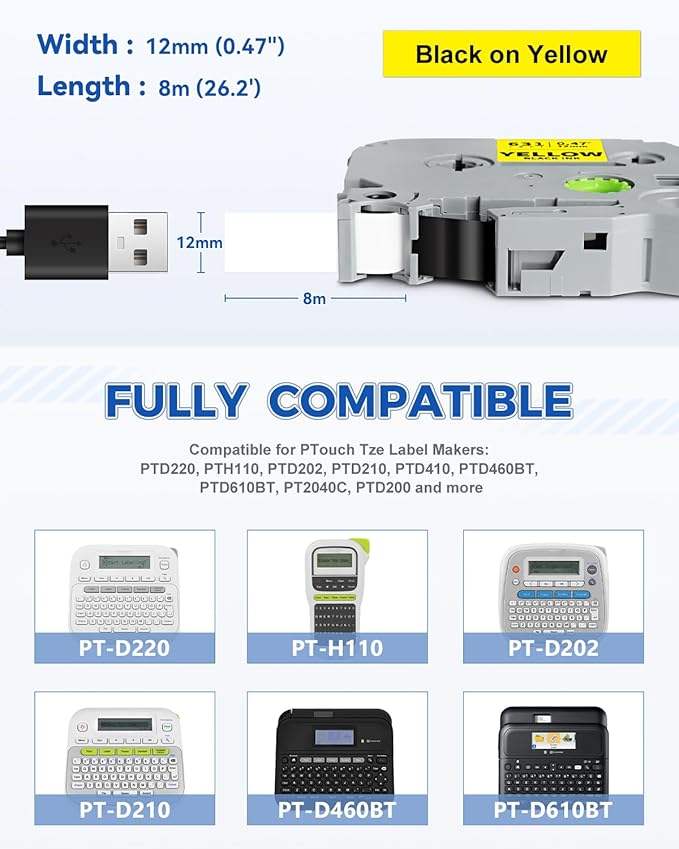 - Features: Our 12mm 0.47" yellow label maker tape split design makes the label tape easy to peel and apply, with strong adhesion/waterproof/temperature/oil/abrasion/fading, and reliably sticking to various surfaces