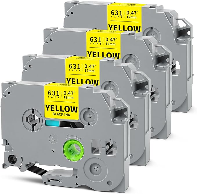 - Packages: 4-Pack 12mm 0.47" yellow label tape compatible with Brother tze-631 12mm 0.47 black on yellow tape. Color: Black on Yellow. Size: 1/2 inch (12mm 0.47") x 26.2 feet (8m)