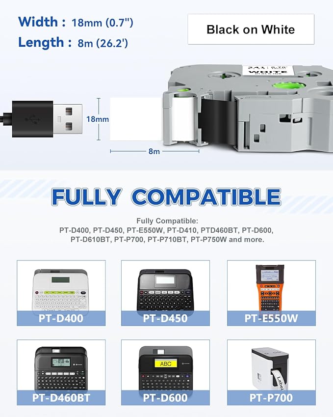 - Compatible for Brother Tze 18mm Label Makers: PT-D410, PT-D460, PT-D410VP, PT-D610BT, PT-D610BTVP, PT-D600, PT-D400, PT-D450, PT-E300, PT-H300, PT-E500, PT-E550W, PT-H500, PT-P700, PT-P710BT, PT-P715eBT, PT-P750W, PT-18R, PT-18RKT, PT-D800W, PT-E800W, PT-P900, PT-P900W, PT-P950NW, PT-P910BT