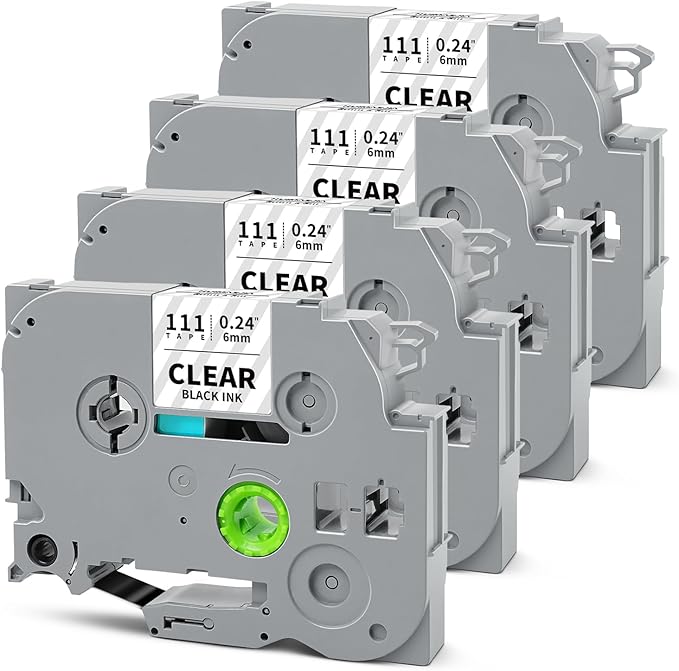 - Packages: 4-Pack 6mm 0.23" clear label tape compatible with Brother tze-111 tze111 tz-111 6mm 1/4" black on clear label maker tape. Color: Black on clear. Size: 1/4 inch (6mm 0.23") x 26.2 feet (8m)