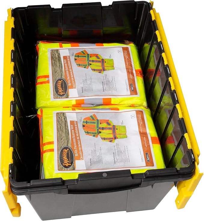 Akro-Mils KeepBox 12 Gallon Storage Container, Nesting and Stackable Plastic Storage Box with Lid Attached, Clear Tote for Garages, Closets, and Moving, 21-1/2" x 15" x 12-1/2", Black/Yellow, 6-Pack