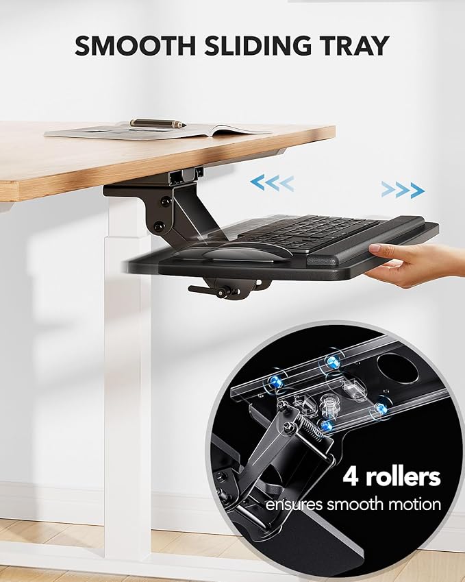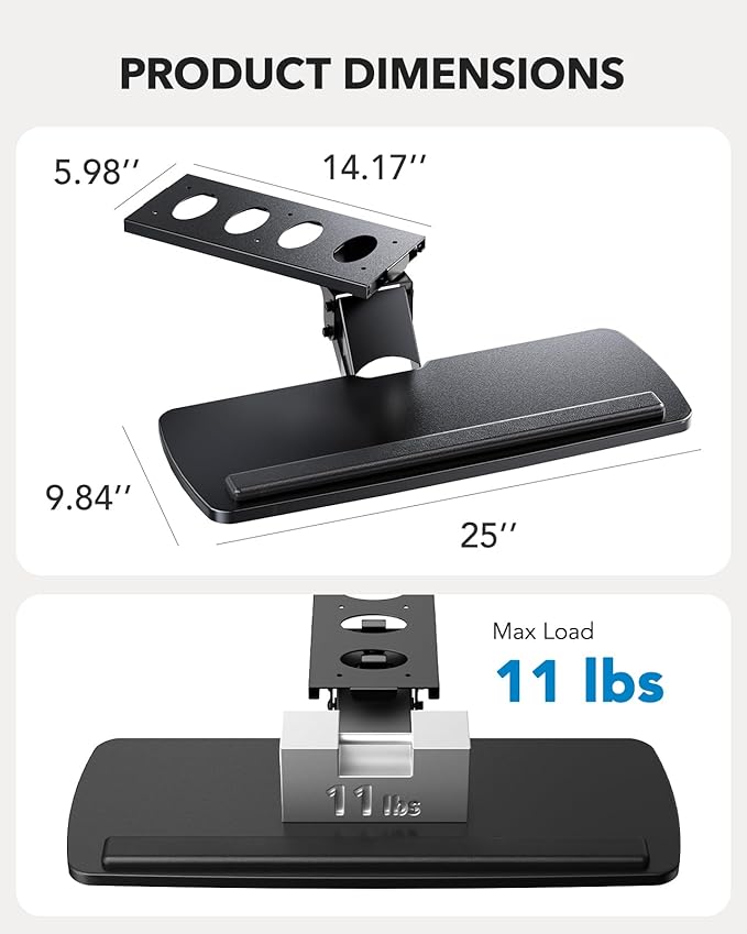 - Spacious & Compatible Size: 25β x 9.84β keyboard tray fits most keyboards and mice. Desk keyboard tray features a wrist rest to reduce wrist soreness, and prevent the keyboard from sliding off when the tray is tilted. This pull out keyboard tray under desk can hold up to 11 lbs, supports heavy mechanical keyboards and mouse
