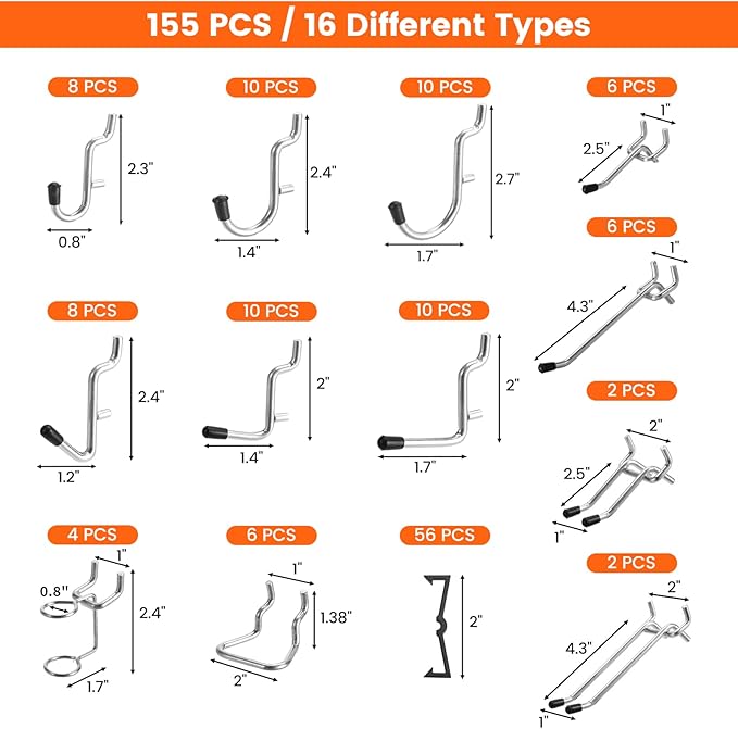 - Diverse Accessory Set: The ENJOYWOOD pegboard organizer accessories kit includes 155 pegboard accessories in 16 different types, including curved hooks, oblique hooks, straight hooks, ring tool racks, multi-tool racks, pegboard boxes, and pegboard baskets, etc. 56 of them are buckles for fixing hooks