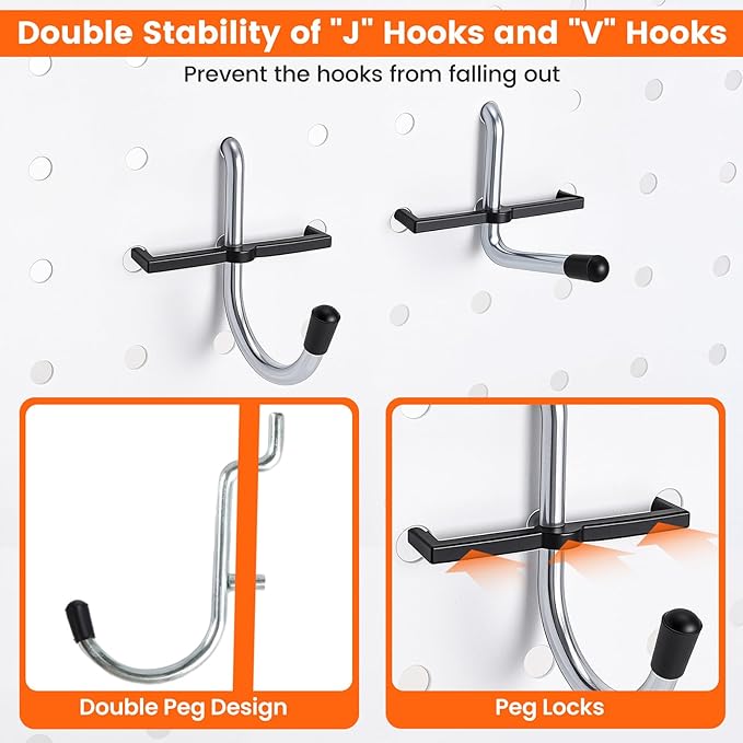 - Durable and Stable: The pegboard hooks for hanging are constructed with hardened steel and feature a galvanized surface, delivering high strength, rust and corrosion resistance. The pegboard bin is made of high-density hard plastic for durability. The 'J' and 'V' hooks feature a double peg design and are equipped with buckles to prevent shaking and detachment