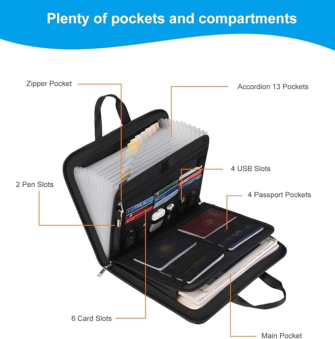 - Large-capacity: Including 13 folding pockets with tags, 1 zipper pocket, 1 pen slots, 9 card slots, 6 USB ports, 4 paspassport size pockets and 1 main pocket, effectively organizing and easily finding all your files in one place with our accordion folder. With multiple pockets and a multi-layer design, you can organize your things flexibly and your paper won't wrinkle. Meet all your storage needs!