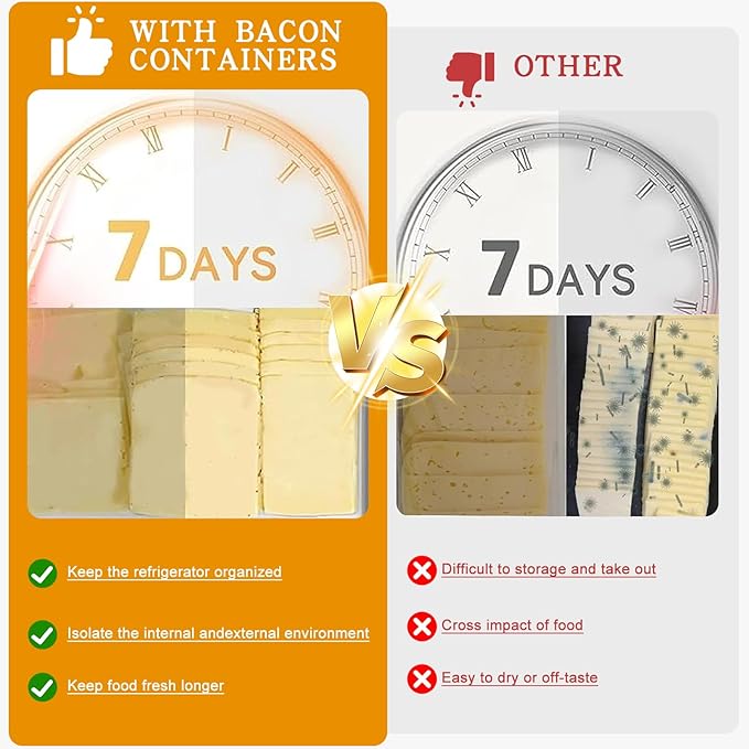 - Airtight Seal: Designed to seal tightly, these deli cheese vault prevent gas exchange and shield your food from environmental influences.Say goodbye to refrigerator odors spreading, as these bacon keepers maintain a pristine storage environment,This effectively prevents odors from spreading and keeps your fridge smelling fresh,can be used to store all types of cheeses,such as swiss cheese,shredded cheese,cheddar,cottage cheese,velveeta cheese block,shredded ,parmesan, blue cheese, etc.
