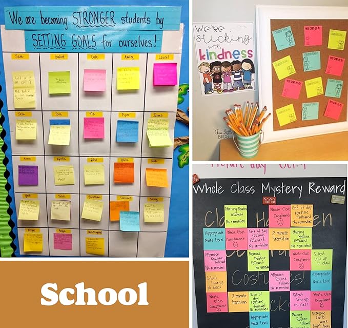 - Wide range of uses: Adhesive notes perfect for students, teachers or anyone who needs colorful reminders. Widely use for school, office, family. Great for leaving notes or reminders on walls, doors, monitors, or other surfaces.These sticky notes help keep your workspaces organized and your thoughts clearly visible.