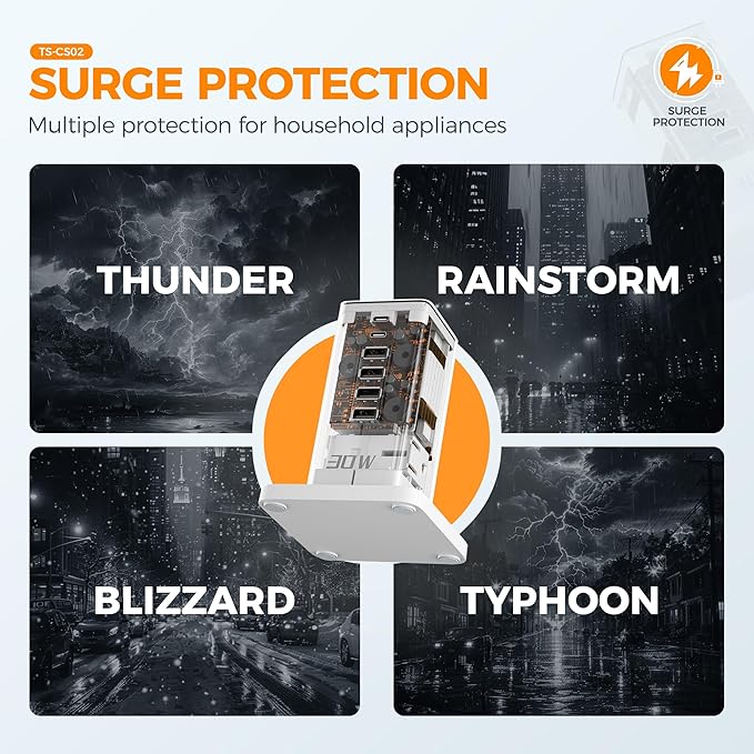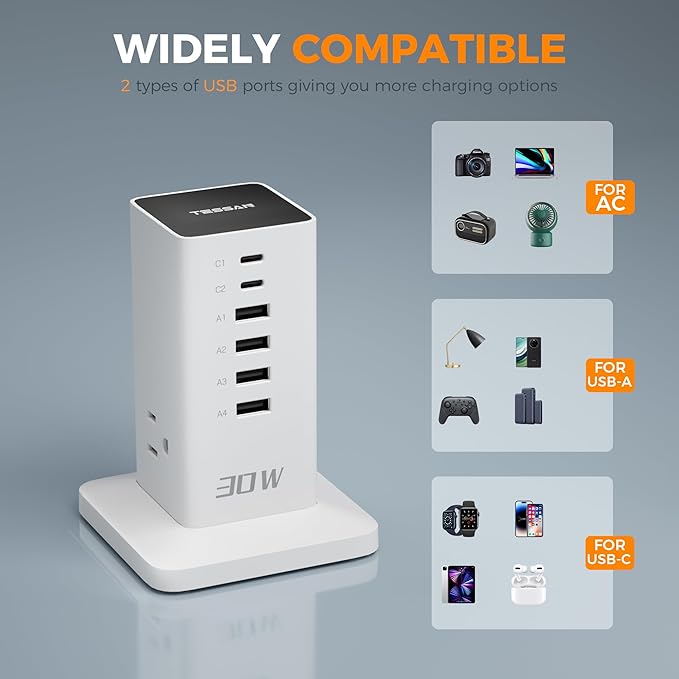 - Surge Protector Tower: Equipped with overload protection, short-circuit protection, over-current protection, heat resistant and etc; this usb charger block multiple ports can protect your expensive electronics, providing you with a safe and reliable charging environment