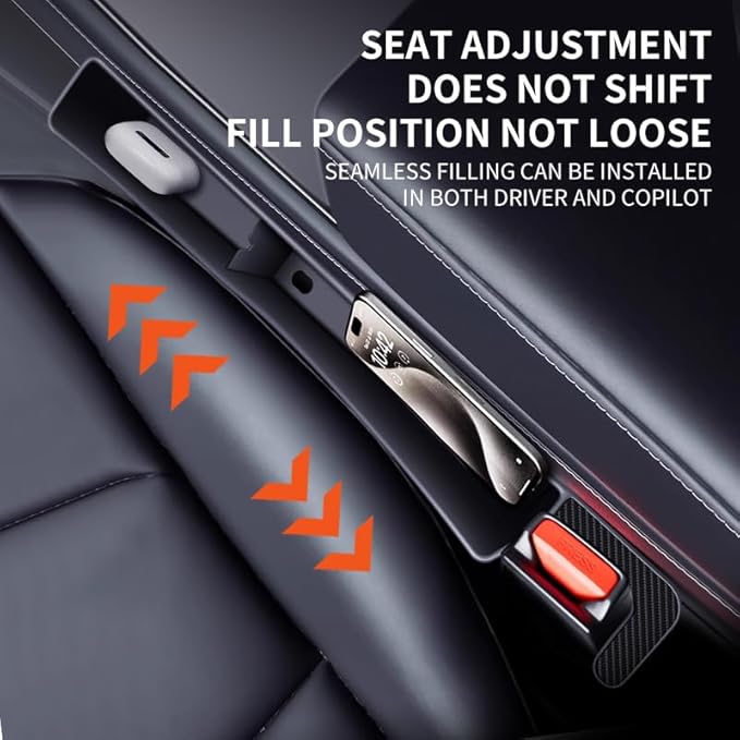 - Versatile Design: This black car seat gap filler not only provides ample storage space but also comes equipped with USB ports and a phone holder, allowing you to charge your devices and keep your phone securely in place anytime, anywhere Reserve space for the seat belt buckle, without affecting the normal use of the seat belt. It also does not affect the movement of the seat. After installation, it is allowing the seat to move dynamically back and forth.