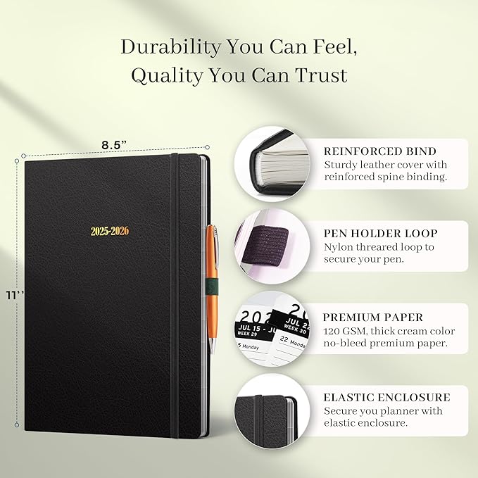 Ensight 2025-2026 HARDCOVER Leather Planner Weekly & Monthly - 8.5x11 Inches - Academic Planner Business Personal or Student - Pen Holder, Thick Paper, July 2025 - June 2026 (Black)