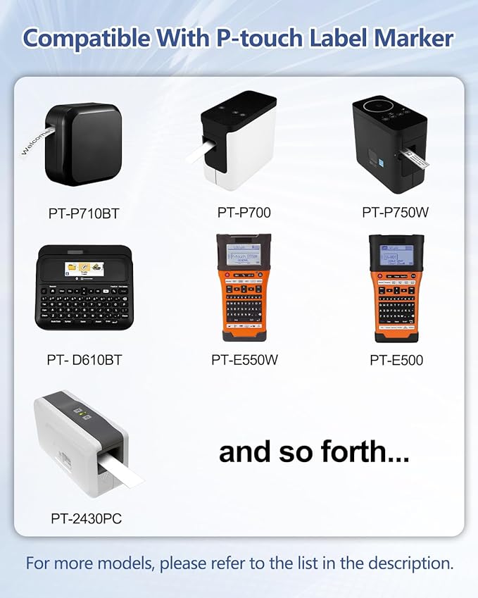 - Compatible with P touch Printer: PT-P900W, PT-P950NW, PT-P710BT, PTD400AD, PT-P700, PTD600, PT-1890C, PT-1890SC, PT-1890W, PTD600VP, PT-P750W, PT2730VP, PTD450, PT1880C, PT-1880, PT-18R, PT-E300, PT-H300, PT-H300LI, PT-H500LI, PT2730, PT-2430PC, PT-2300. For more, please see the description below.