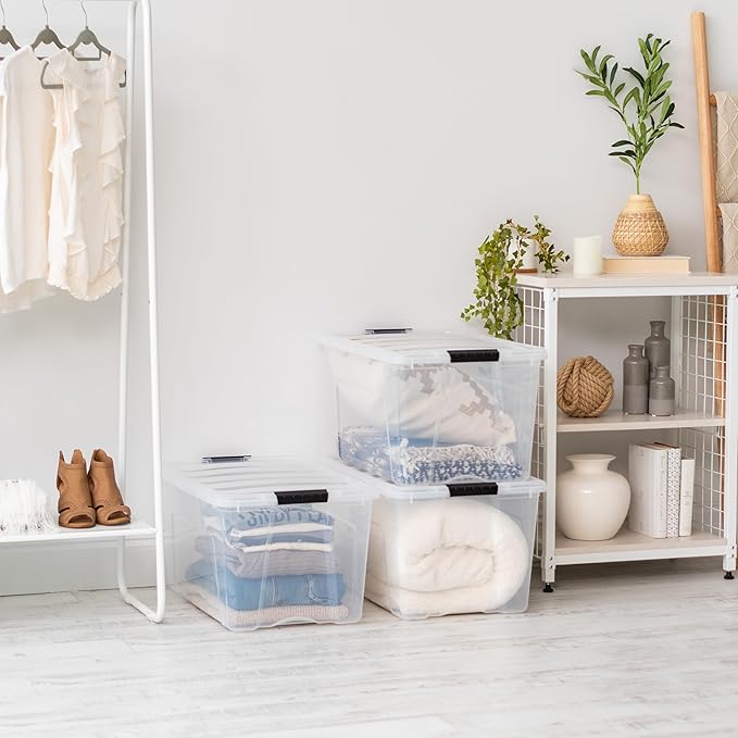 IRIS USA 72 Qt Stackable Plastic Storage Bins with Lids, 6 Pack - BPA-Free, Made in USA - See-Through Organizing Solution, Latches, Durable Nestable Containers, Secure Pull Handle - Clear