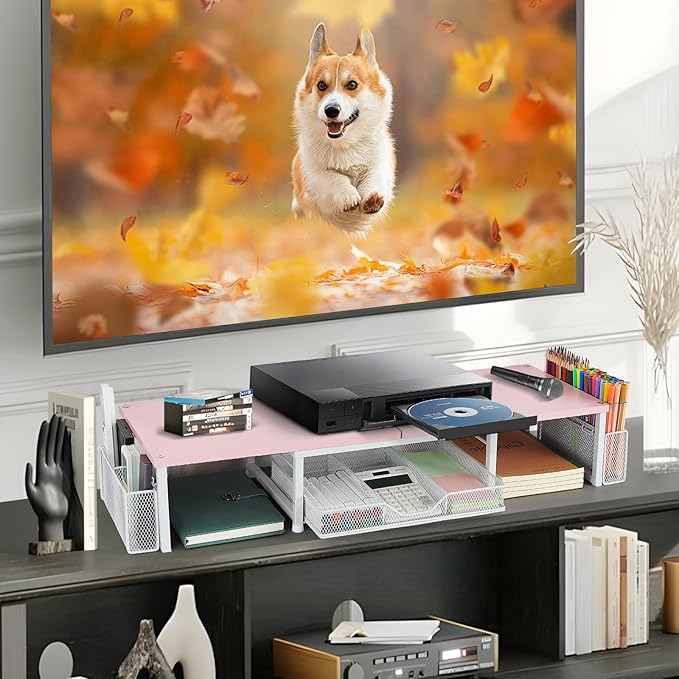 Desk Dual Monitor Stand Riser - Desk Organizer with Drawer and Pen Holders, Office Desk Accessories & Workspace Organization, Computer Monitor Stand for Laptop, Printer(Pink& White)