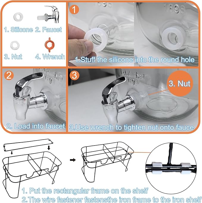 - What You Get: Include 2 x Glass beverage dispenser, 2 x 304 Stainless Steel Cover, 2 x Faucets, 1 x Black Metal Bracket, 1 x Orange Ring Used As A Wrench, 2 x Small Handwriting blackboard