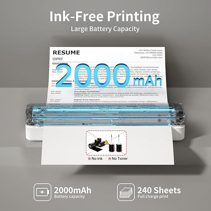 - Long-Lasting Battery: This compact printer features a built-in 2000mAh rechargeable battery, capable of printing up to 240 sheets (approx. 4 hours of continuous use). The small printer for professionals - print contracts, documents and files effortlessly at home, office or in a vehicle
