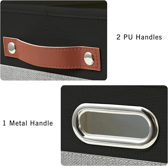 Large Collapsible Fabric Storage Bins with 3 Handles, Foldable Organizer Baskets for Closet, Shelves, Living Room | 3 Pack, Durable PU & Metal Handles (14.9"x9.8"x9.8", Black & Gray)