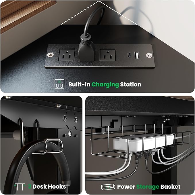 - 【Enjoy Easy and Convenient Charging】The L-shaped standing desktop features 3 AC outlets and dual USB fast-charging ports (Type-A/C) for all your devices. Built-in cable management with two headphone hooks keeps wires organized, maintaining a clean workspace effortlessly.