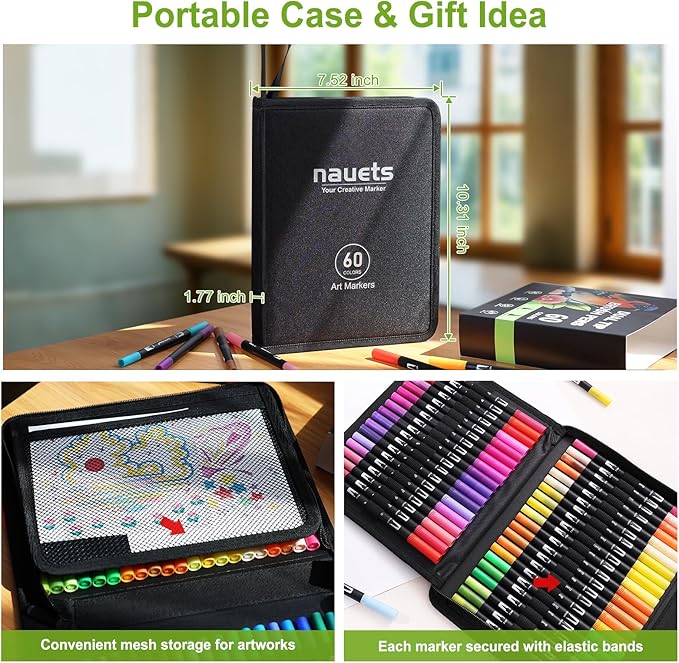 - π¨ Packing List: 1 x Portable Case, 60 x Coloring Markers, 3 x Bonus Brush Tips & 3 x Bonus Fineliner Tips. The Marker Pens set comes in a well-organized case, making it easy to select and store your markers. The coloring markers are packaged in a durable and attractive case, offering enhanced protection for the pens during transportation. The built-in elastic cord secures the paint pens in place, making them convenient to carry, the outer zipper with stitching is easy to open and close. If you have any issues with the products or orders, please feel free to contact us.