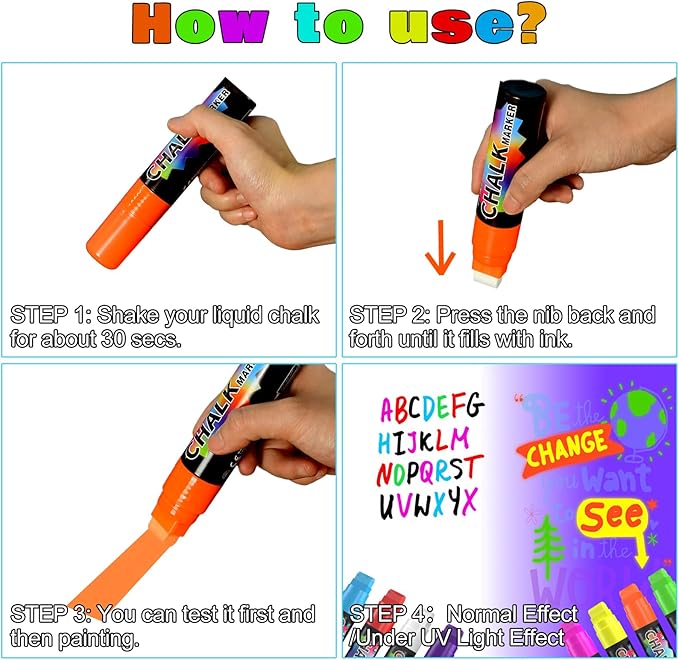 - 12 Vivid Colors: 6 Vivid colors (White, Purple, Blue, Red, Coffee, Black),2 Metallic colors (Gold, Sliver) and 4 fluorescent colors (Pink, Orange, Yellow, Green). Fluorescent colors that only glow under UV or neon lights. Liquid chalk uses newly upgraded inks with more vibrant colors. Add style and get creative for Halloween, Christmas, holiday parties and more.