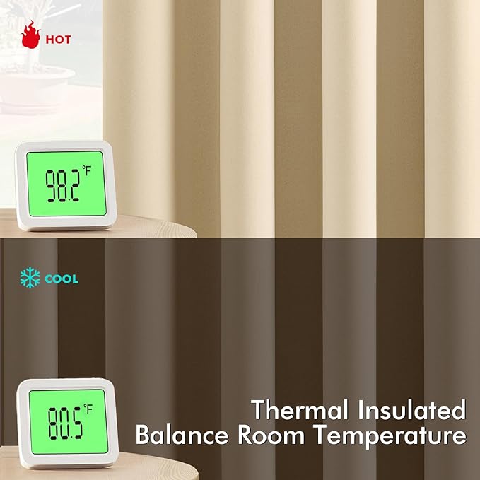 - High-Quality Material: Crafted from high-quality 225GSM polyester fabric, these curtains offer enhanced durability and elegant drape. The soft blackout material features triple-layer weaving technology, with a middle layer of black yarn for superior light blocking and privacy. Both sides feature the same refined color, ensuring a seamless look that elevates your home’s aesthetic with understated sophistication