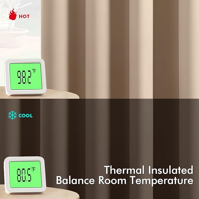 - High-Quality Material: Crafted from high-quality 225GSM polyester fabric, these curtains offer enhanced durability and elegant drape. The soft blackout material features triple-layer weaving technology, with a middle layer of black yarn for superior light blocking and privacy. Both sides feature the same refined color, ensuring a seamless look that elevates your home’s aesthetic with understated sophistication