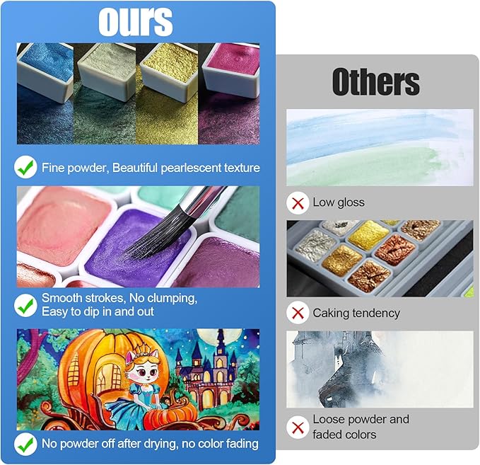 - 【Smooth Strokes, No Powder Off After Drying】: Our watercolor paints are fine powder with smooth strokes that won't clump. The powder will not fall off after drying, making the artwork shine forever