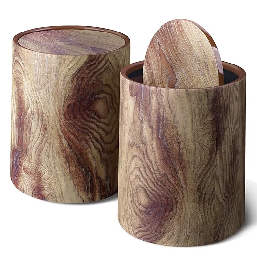 Wood Grain Plastic Trash Can Swing Top Lid, 4Gal/15L Farmhouse Wastebasket Bin Retro Style with Inner Bucket, Bathroom Trash Can Hidden Bag for Room Aesthetic, Round Brown Garbage Can 2pack