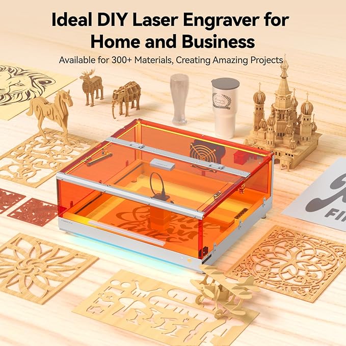 - 【Class 1 Safety Certified Machine】This certified Class 1 cutting and engraving machine provides safety assurance for users at all levels, from beginners to professionals. Its smart enclosure integrates powerful features including smoke exhaust, laser blocking, auxiliary lighting, and safety interlock systems. The 360° fully-enclosed lid filters 99% of laser emissions, eliminating the need for additional enclosures or protective goggles. The laser module instantly deactivates when the lid is gently opened, ensuring continuous protection for both you and your artwork.