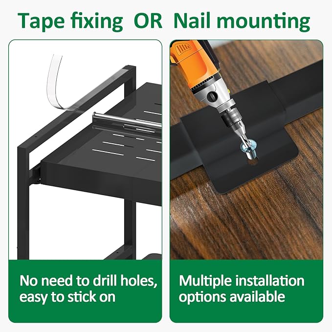 - Easy to Install: Our cabinet storage comes with step-by-step instruction and all necessary hardware for quick installation in 10 minutes. Two mounting methods are available: 1. Tape mounting, no drilling required; 2. Drill holes and use an electric screwdriver for a more secure mount