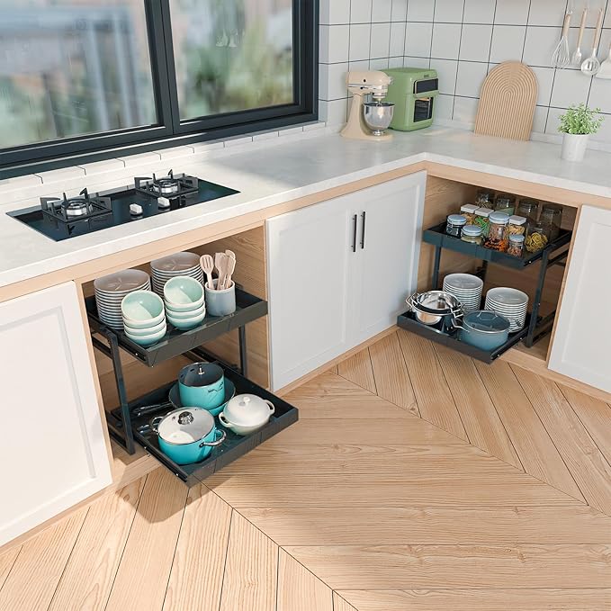 - Expandable Cabinet Storage Shelves: Our 2-tier pull-out cabinet shelves feature an expandable design (Width: 14" - 22.5", Depth: 21", Height: 16") to accommodate cabinets of various sizes. This extendable cabinet drawer maximizes vertical space within cabinets, with each tier capable of sliding out independently for easy access to items at different levels