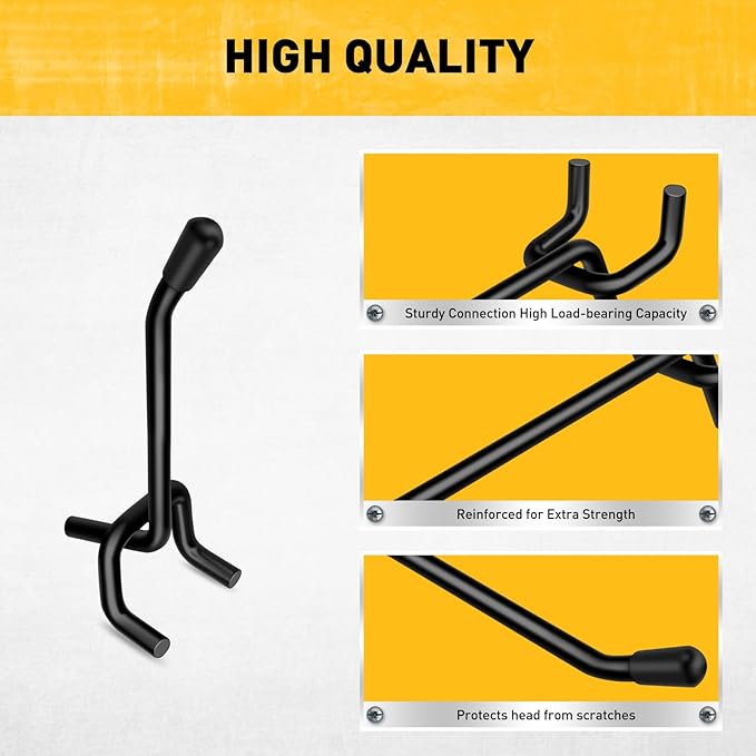 - 3X EXTRA THICK - Crafted from premium hardened steel with a matte black powder-coated finish, these pegboard tool hooks are 3x thicker and heavier than most competitors. Engineered for strength and corrosion resistance, each hook supports up to 55 lbs — perfect for daily heavy-duty use.