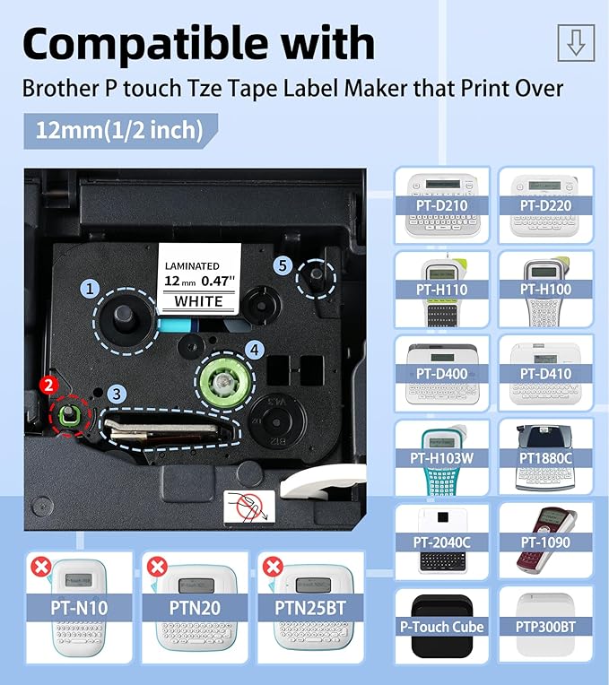- 【Compatible for Brother TZe Tz 12mm Label Maker】PTD210, PTD220, PTH110, PTH111, PTD200, PT1280, PT2040, PTD410, PTD610BT, PT1290, PT1880, PT1890, PT310, PT310B, PT320, PT330, PT340, PT350, PT380, PT520, PT530, PT540, PT550, PT580C, PT1000, PT1000BM,PT1010, PT1090, PT1090BK, PT1100, PT1120, PT1130, PT1160, PT1170S, PT1180, PT1190, PT1200, PT1230PC, PT1300, PT1400, PT1500PC, PT1600, PT1650, PT1700, PT1750, PT1760, PT1800, PT1810, PT1830, PT1900, PT1910, PT1950, PT1960, PT2030 and more