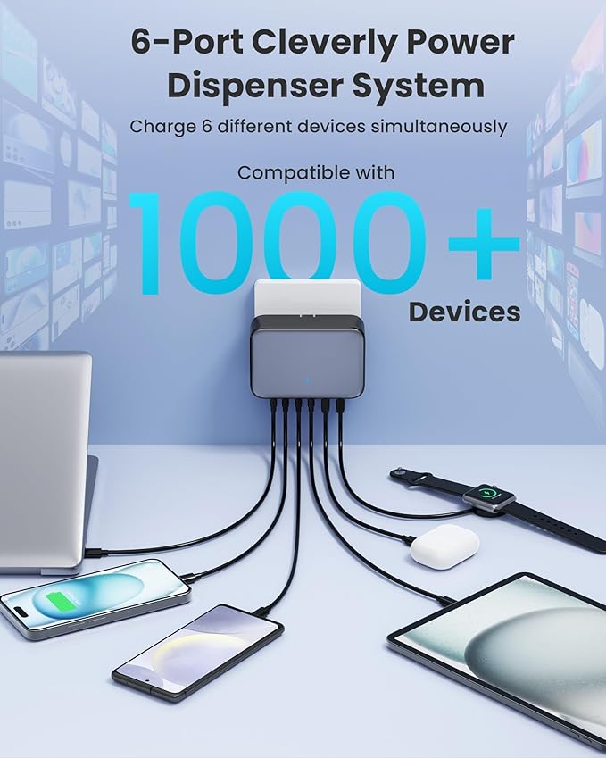 - 【USB Charging Station for Multiple Devices 6 Ports】Power up multiple devices simultaneously with 6 ports, 4 USB-C Ports and 2 QC USB-A Ports, delivering high-speed charging for Macbook Pro 13” (with our usb c1 port of 65w),iPhone 17/16/15, Android Samsung Galaxy S23. Universal Compatibility for any smartphones, tablets, laptops and more USB smart devices.