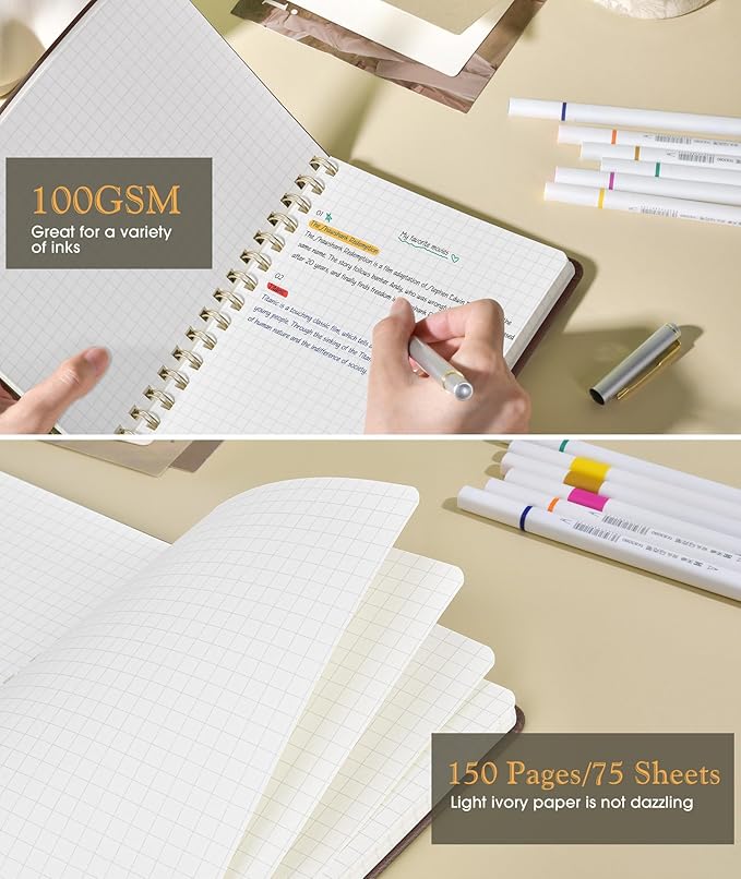 Graph Spiral Journal Notebook, A5 Hardcover Spiral Journals for Women Men, 100 GSM Graph Paper Notebooks, 150 Pages Spiral Bound Grid Notebook for Writing Note Taking Work 5.75" x 8.38", Dark Brown