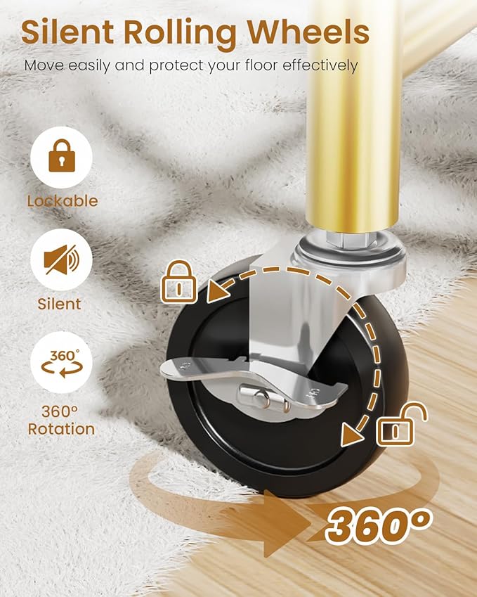 - 𝙎𝙈𝙊𝙊𝙏𝙃, 𝙍𝙊𝙇𝙇𝙄𝙉𝙂 & 𝙇𝙊𝘾𝙆𝘼𝘽𝙇𝙀 𝘾𝘼𝙎𝙏𝙀𝙍𝙎: The casters of our coat rack have been carefully designed to move over a variety of floors such as hardwood, tile or carpet. Additionally, the 2 lockable wheels provide security, allowing you to keep your wardrobe rack securely in place when needed.