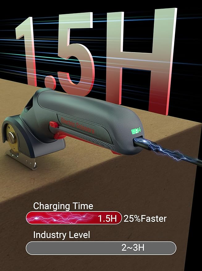- LONG RUNTIME AND QUICK CHARGING: This electric box cutter is equipped with a 2000mAh battery and a powerful 300RPM motor (more efficient than 220RPM models). Enjoy up to 60 minutes of runtime, while most electric scissors for cardboard only last 40. The recessed charging port keeps the cable stable and secure during every charge and recharge in just 1.5 hours via USB