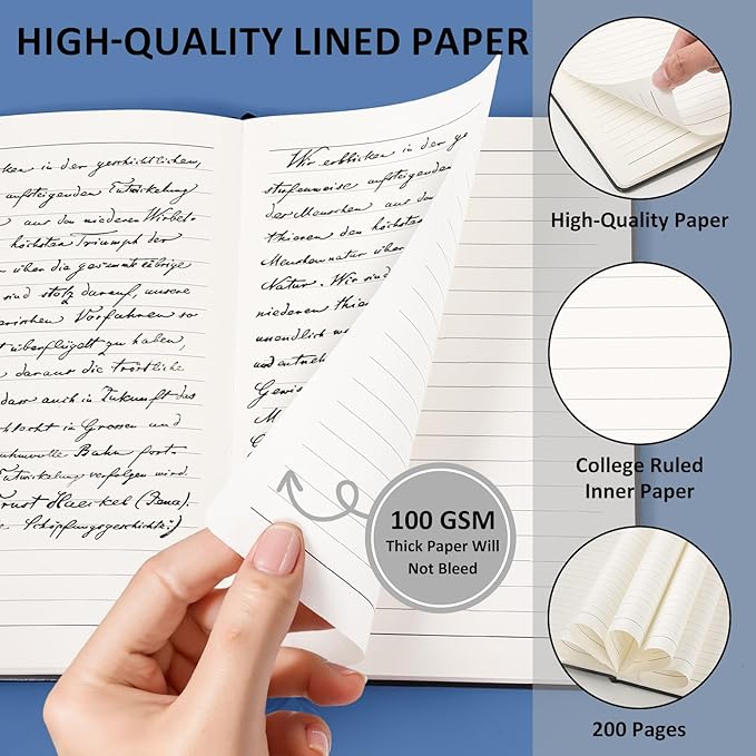 - 100Gsm Premium Paper - We use 100Gsm acid-free paper thick lined paper. Our journal paper is thicker than average notebooks & writing pads, so you can confidently use most pens, pencils, and markers. This superior-quality paper prevents any ink bleed-through, ensuring every note, sketch, or idea remains pristine and undisturbed on both sides. The Light yellow paper resists damage from light and air, and the paper protects your eyes from irritation.