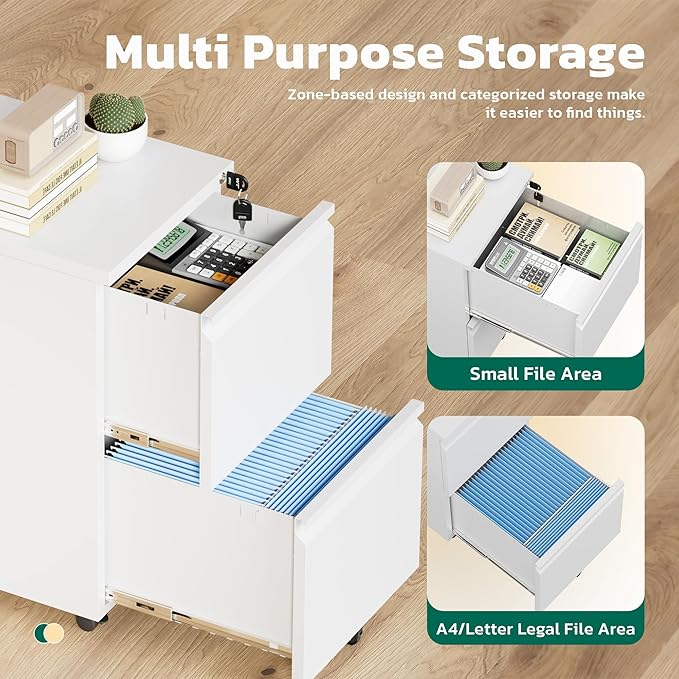 Greenvelly 2 Drawer Mobile File Cabinet with Lock, Metal Filing Cabinet on Wheels, Under Desk File Cabinet for Home Office Organizer Letter/Legal/A4 File (Assembly Required, White)