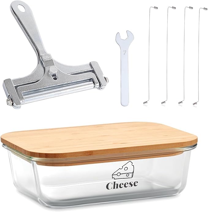 - Value Bundle: When you buy this set,you'll get a fresh-keeping cheese storage container for fridge plus a wire cheese slicer, 1 piece of wrench and 4 pieces of wire. This set will help you quickly cut cheese blocks and get thin cheese slices easily.This cream cheese block storage container is dishwasher safe.Please note: This sealing lid is not dishwasher safe. Hand washing with mild detergent is recommended to preserve the silicone gasket integrity and ensure long-term airtight performance.