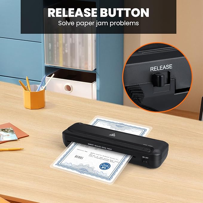 - Our laminating machine is equipped with an ABS button specifically designed to minimize paper jams. With a simple press of the "Jam-Release" button, you can effortlessly extract documents using one hand while ensuring your files remain intact. Bid farewell to jams and embrace a seamless laminating experience