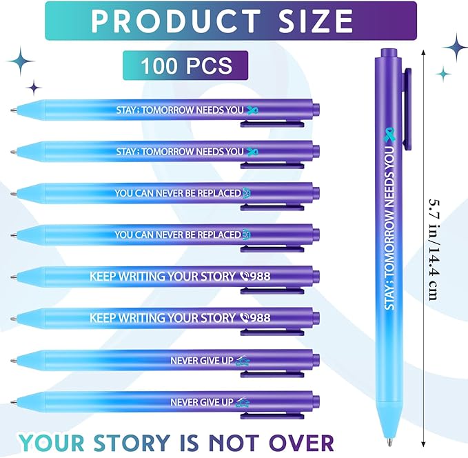 - Suitable for Adolescent Mental Health Activities: our suicide prevention awareness pens are also ideal for use in addressing and promoting adolescent mental health through school and community programs; They convey essential mental health messages to the younger generation, providing the support they need during their formative years
