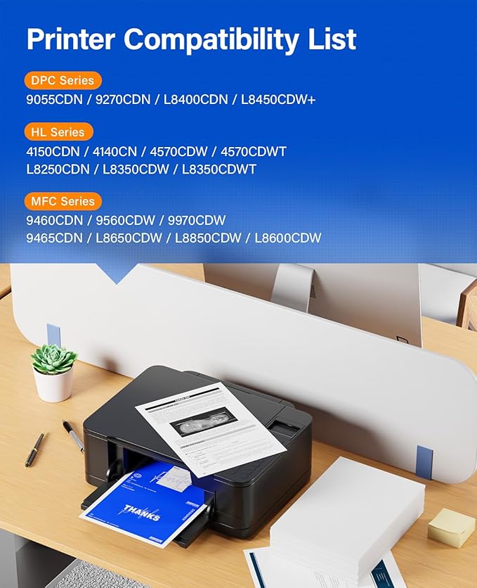 - To use with: Compatible for Brother DCP-9055CDN, DCP-9270CDN DCP-L8400CDN, DCP-L8450CDW HL-4150CDN, HL-4140CN, HL-4570CDW HL-4570CDWT, HL-L8250CDN, HL-L8350CDW, HL-L8350CDWT MFC-9460CDN, MFC-9560CDW, MFC-9970CDW MFC-9465CDN, MFC-L8650CDW, MFC-L8850CDW, MFC-L8600CDW Laser Printer.